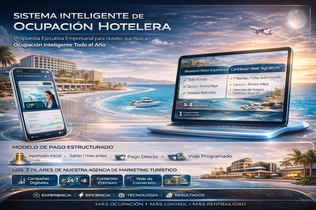 Implementamos para tu hotel un ecosistema 360 de ventas inteligentes con inteligencia artificial, automatización, embudos de conversión y atención 24/7 multilingüe, respaldado por campañas de publicidad de alto rendimiento diseñadas para atraer clientes con intención real de compra. Lo más poderoso: la implementación del sistema no tiene costo. Nuestra operación se activa a cambio de un esquema premium basado en habitaciones, alineando completamente nuestro éxito con el tuyo. Si tú vendes más… nosotros crecemos contigo.